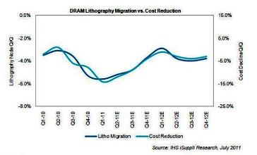 “A fuerza de perseguir la reducción de litografías a finales de 2010 y principios de 2011, está previsto que la industria de DRAM emplee un enfoque menos agresivo para la migración a la técnica de la litografía el resto del año”,comenta Dee Nguyen, analista de IHS especializado en memorias. “Se prevé que los gastos de capital de las memorias DRAM disminuyan en un 30% este año con respecto a 2010. Como resultado, la tasa de reducción de costes DRAM también se desacelerará durante el resto de 2011 y 2012. No obstante, IHS espera que la reducción de costes DRAM se acelerará de nuevo en 2013 en tanto en cuanto se reduzca el retorno a la litografía, debido a un aumento de los gastos de capital. Estos costes se incrementarán en un 23% en 2012, lo que puede estimular mayores reducciones de precios en 2013”, añade Nguyen.