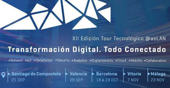 Tras el éxito de la pasada edición, la Asociación @asLAN celebra un año más el Tour Tecnológico bajo el título «Transformación Digital. Todo Conectado», un espacio de encuentro y divulgación tecnológica en cinco grandes ciudades españolas: Santiago de Compostela, Valencia, Barcelona, Vitoria y Málaga.