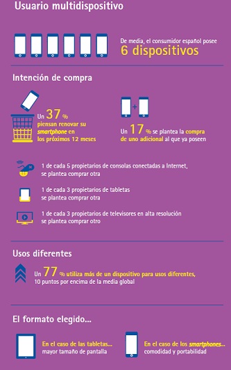 Los españoles somos digitalmente avanzados si nos comparamos con la media global. La mitad de los consumidores españoles se definen como receptivos a las nuevas tecnologías, es decir, las adoptan de forma rápida o medianamente rápida tras su lanzamiento al mercado. Un dato que se deriva de la gran penetración de smartphones(96%) y ordenadores personales (93%) y por el interés por la mayoría de los servicios digitales, principalmente los relacionados con automoción, navegabilidad, salud, hogar y seguridad. De hecho, el consumidor español posee una media de seis dispositivos (entre teléfono móvil, ordenador personal, televisión, consola de videojuegos, tableta, navegador GPS, lector de libros electrónicos, decodificador televisión/cable y sistema de entretenimiento en el coche) y muestra una gran tendencia tanto a renovarlos como a seguir aumentando su número. Estas y otras conclusiones se extraen del estudio conjunto de Ametic y Accenture titulado Somos Digitales, 2014 Digital Consumer Survey España.