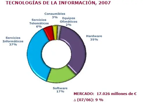 El mercado de las tecnologías de la información en 2007 consolidó la línea de crecimiento que inició hace cuatro años, al lograr en éste un incremento del 9 por ciento y llegar a los 17.026 millones de euros. En este sentido, los servicios informáticos lideran los segmentos de mayor peso en este mercado con un 37 por ciento, seguidos del hardware y el software, con un 35 y 17 por ciento, respectivamente.