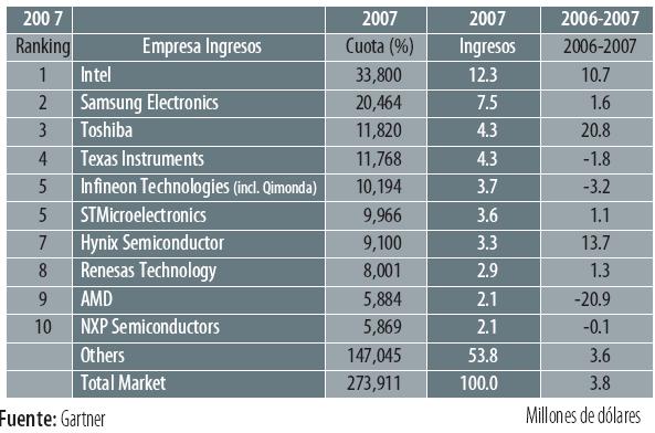 El mercado mundial de ventas de semiconductores ha experimentado un ligero crecimiento del 3, 8 por ciento. Cabe destacar el crecimiento de Intel, de un 10, 7 por ciento, con ingresos que rondan los 30, 522 millones de dólares, y de Toshiba, con un 20, 8 por ciento. Por el contrario, AMD ha sufrido un desplome del -20, 9 por ciento.
