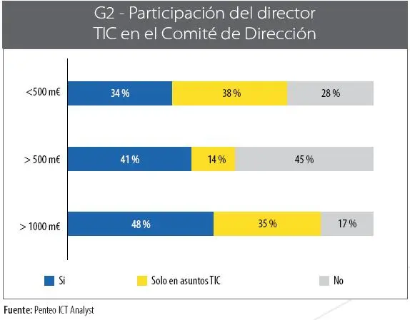 Un estudio realizado por Penteo analiza la participación del director TIC en el Comité de Dirección. En este sentido, los resultados muestran que aumenta la presencia de los directores TIC. Uno de cada tres directores TIC está presente en los mismos en el caso de las compañías con facturación inferior a 500 millones de euros; este porcentaje crece hasta casi uno de cada dos en el caso de las compañías con mayor facturación (superior a 1.000 millones de euros).