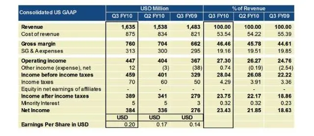 Tata Consultancy Services (TCS), una de las empresas de servicios TI más importantes de la India, ha registrado un buen desempeño en el sector por tercer trimestre consecutivo. En los resultados de su tercer trimestre del ejercicio fiscal de 2010, cerrado en diciembre de 2009, la compañía ha obtenido unos ingresos de 1.640 millones de dólares, que con respecto al mismo periodo del año anterior supone un aumento del 10,3 por ciento, y con respecto al segundo trimestre de 2009, del 6,3 por ciento.