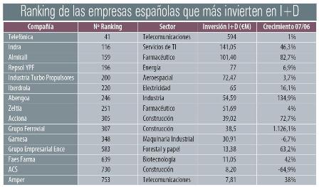 Ninguna firma de TI española figura en los primeros puestos, pero Telefónica está entre los 50 primeros de las 1.000 que conforman el ranking, con una inversión de 594 millones de euros. Le sigue Indra, que ocupa el puesto número 116 con 141,05 millones. Con todo, tan sólo 21 empresas españolas de diversos sectores forman parte del Investment Scoreboard, contabilizando un total de 1.340,24 millones de euros, esto es un 16,9 por ciento más que el año anterior