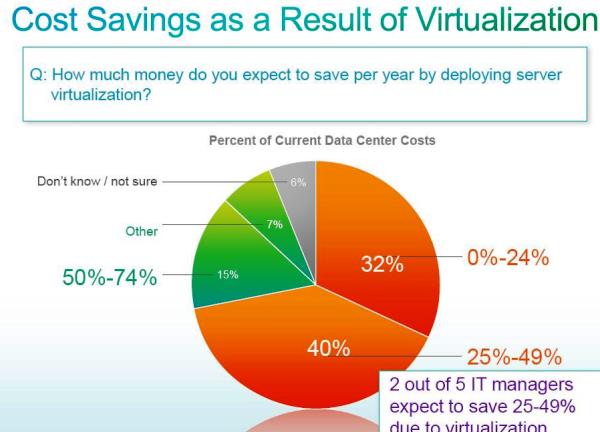 De los ahorros derivados de la virtualización, dos de cada cinco empresas consultadas esperan reducir los costes del centro de datos entre un 25 y un 49%, mientras el 30% estima unos ahorros de hasta el 24%. En España, un 42% de empresas prevén unos ahorros de entre el 25 y el 49%.