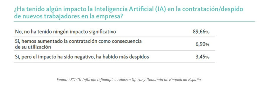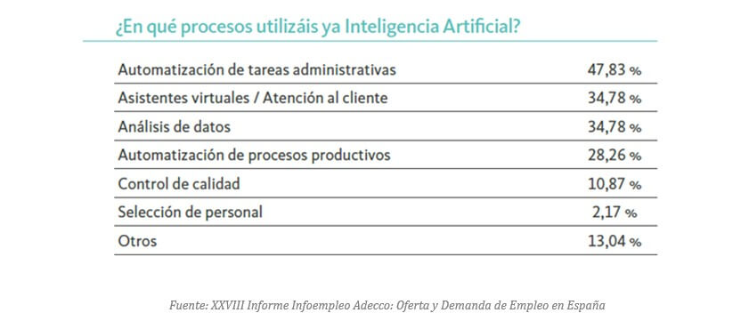 Entre aquellos/as que ya utilizan la IA en su puesto de trabajo, casi la mitad (47,83%) la emplea para automatizar tareas administrativas, un 34,78% cuenta con asistentes virtuales y/o de atención al cliente y otro 34,78% usa la IA para el análisis de datos. Además, un 28,26% asegura usar la IA para automatizar procesos productivos, para controles de calidad (10,87%) o para procesos de selección de personal (2,17%). El 13,04% usa la IA para un abanico dispar de tareas: programar, hacer presentaciones, generar contenidos, campañas de marketing o similares.