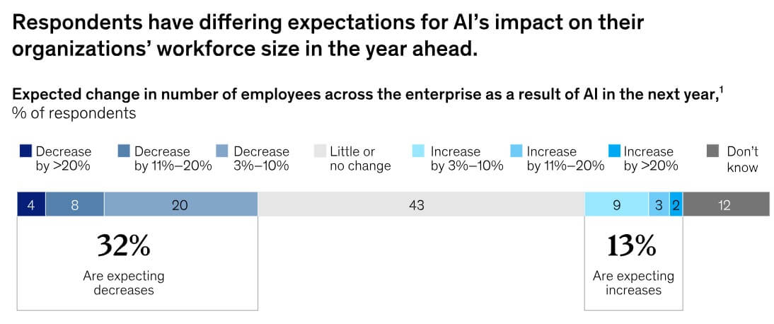 Por otro lado, según McKinsey & Company, las empresas más grandes son las que con mayor frecuencia prevén reducciones de empleo vinculadas a la IA.