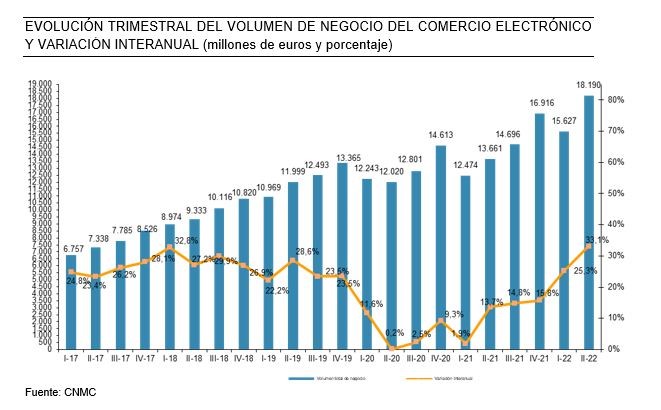 La facturación del comercio electrónico en España ha aumentado en el segundo trimestre de 2022 un 33,1% interanual hasta alcanzar los 18.190 millones de euros, según los últimos datos de comercio electrónico disponibles en el portal CNMCData.