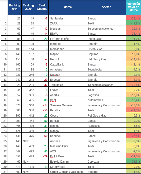 Por sectores, los que poseen mayor número de marcas son Textil con 7 marcas( Zara, Loewe, Bershka, Mango, Massimo Dutti, Pull & Bear y Stradivarius ), Banca con 5 marcas ( Santander, BBVA, CaixaBank, Bankia y Sabadell ), Energía ( Iberdrola, Naturgy y Endesa ) e Ingeniería y Construcción ( Siemens Gamesa, Acciona y ACS ) con 3 marcas.