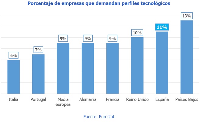 La alta demanda de perfiles de este tipo pronostica un aumento de la importancia del empleo tecnológico en nuestra economía, aún discreto en comparación con nuestros vecinos. El 18% de las empresas de nuestro país emplean a perfiles tecnológicos, una tasa dos puntos porcentuales inferior a la media europea, que se sitúa en el 20%. Los países europeos con más empresas con talento tecnológico son Irlanda (32%), Bélgica, Dinamarca (ambos con 28%) y Países Bajos (27%). El nuestro se ubica por delante de países como Francia (17%) o Italia (16%).