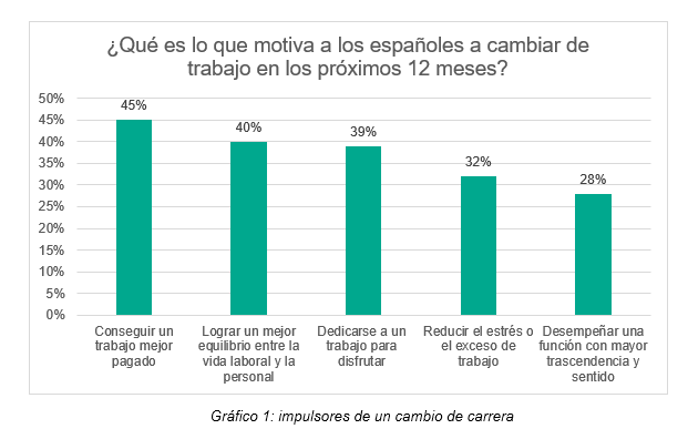 Sea cual sea la dirección que elijan, la mayor motivación de los encuestados españoles para plantearse un nuevo trabajo es conseguir un mejor salario (45%). La creación de un mejor equilibrio entre la vida laboral y personal es la segunda razón más frecuente (40%) . La pandemia ha desvelado la satisfacción que produce pasar más tiempo en casa con la familia, así como poder dedicarse a intereses y aficiones personales. Es posible que los empleados quieran mantener esta oportunidad abierta.
