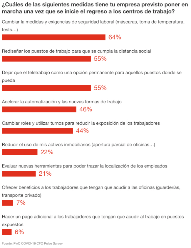 Las dos medidas principales que los CFO están barajando son los cambios en las exigencias de seguridad laboral (64%) y la reconfiguración de los espacios de trabajo para cumplir con la distancia social (55%), aunque hay diferencias entre países y sectores. Por ejemplo, el 77% de los directores financieros en Estados Unidos sitúan la seguridad entre sus prioridades, en comparación con el 33% de los suizos. Además, el 46% de los directores financieros asegura que van a acelerar la automatización y la puesta en marcha de nuevas formas de trabajo.
