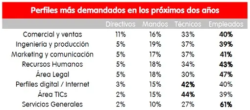 Si analizamos el área funcional y la categoría profesional, será el área de servicios generales el que más empleados demande, pues así lo ha reflejado el 61% de las empresas consultadas. También contratará empleados el área legal, como ha manifestado el 47% de las corporaciones. El departamento digital u online (40%) también demandará empleados en los próximos dos años. A su vez, este ámbito digital y online y el de tecnologías de la información y la comunicación demandarán, además de empleados, profesionales para cubrir puestos técnicos, como han manifestado el 44% y el 42% de las empresas, respectivamente.