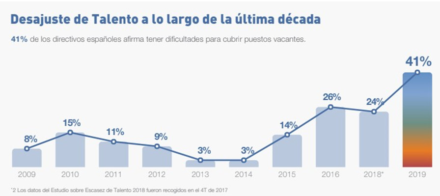Un 41% de los directivos españoles declara tener dificultades para encontrar el Talento adecuado a sus organizaciones. Esta es una de las principales conclusiones del último Estudio ManpowerGroup “Escasez de Talento: Qué quieren los profesionales”. Este informe recoge las respuestas de 14.000 directivos de Recursos Humanos a nivel internacional, entre ellos 1.000 españoles, sobre cómo hacer frente al creciente desajuste de talento global. En España se trata de la cifra más alta desde que se publica el estudio, y prácticamente se duplica respecto al estudio anterior, pasando del 24% al 41%.