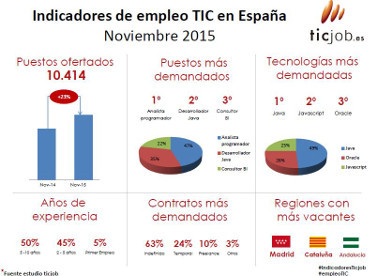 El volumen de ofertas de empleo del sector de las Tecnologías de la Información (TIC) en el mes de noviembre 2015 ha sido de 10.414, lo que supone un incremento del 23% respecto al mismo periodo del año anterior.