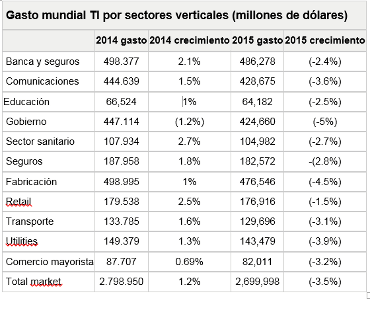 De acuerdo a un estudio conducido por Gartner, el gasto destinado por los diferentes sectores verticales al capítulo de TI disminuirá un 3,5% en 2015 respecto a los 2,6 billones de dólares dedicados el pasado año. La valoración del dólar sobre el euro, el yen y el rublo, junto con la ralentización de los mercados emergentes (especialmente Rusia, Brasil y China) tuvieron un impacto muy negativo en la aplicación de los presupuestos TI y explican esta revisión a la baja del presupuesto inicial.