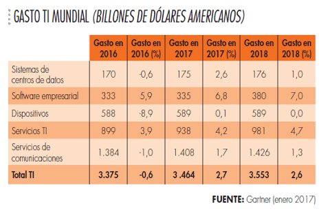 El gasto mundial en TI alcanzará los 3,5 billones de dólares este año, unas tres veces el PIB de España, lo que supone un 2,7% más con respecto a 2016, de acuerdo con las previsiones de Gartner, aunque la cifra no alcanzará el 3% previsto inicialmente. “2017 va a ser el año del repunte del gasto en TI, debido a la convergencia de tendencias como cloud, blockchain, negocio digital e inteligencia artificial. Sin embargo, la consultora advierte que “estas tendencias podrían incrementar esa cifra más allá del 2,7%, pero la inestabilidad política de algunos mercados está provocando una contención”, señala John-David Lovelock, vicepresidente de investigación de la compañía.