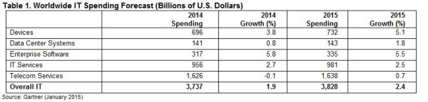 La consultora calcula que el volumen total de gasto en TI será de 3,8 billones de dólares durante 2015, lo que supondrá un crecimiento del 2,4%. Una tasa de crecimiento inferior a la proyectada, que era de un 3,9%. La revisión a la baja para 2015 se atribuye a la subida del dólar y la reducción moderada de las expectativas de crecimiento para dispositivos, servicios de TI y servicios de telecomunicaciones.
