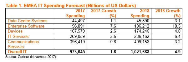 El gasto en TI de EMEA en 2017 fue más débil que el pronóstico general, disminuyendo un 1,4%. La única categoría pronosticada que ha mostrado un crecimiento del gasto empresarial en 2017 es el mercado de software empresarial, con un 3,2%.