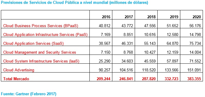 Se prevé que el mercado mundial de servicios en la nube pública crezca un 18% en 2017 alcanzando una facturación de 246.800 millones de dólares, frente a los 209.200 millones de dólares de 2016, según Gartner. El mayor crecimiento provendrá del cloud (Infraestructura como un servicio [IaaS]), que se prevé que aumente un 36,8% en 2017 hasta llegar a 34,6 mil millones de dólares. Por otro lado, cabe esperar que los servicios de aplicaciones en la nube (software como servicio [SaaS]) crezcan un 20,1% hasta llegar a 46,3 mil millones de dólares.