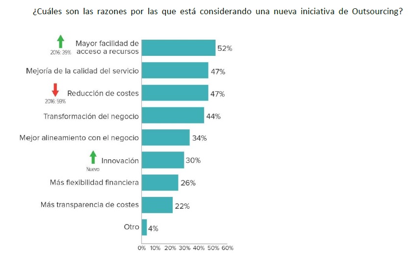 La dificultad de acceso a los recursos ha desbancado por primera vez a la necesidad de reducir costes como la principal razón de las grandes empresas españolas a la hora de iniciar un proceso de externalización de su tecnología. Otros motivos como la búsqueda de la transformación del negocio y de la innovación se consolidan o escalan posiciones en este ‘Estudio sobre Outsourcing de las TIC en España 2017’. Esta tendencia es mayor que la media entre las empresas del sector financiero, mientras que en el sector público es sensiblemente más baja.
