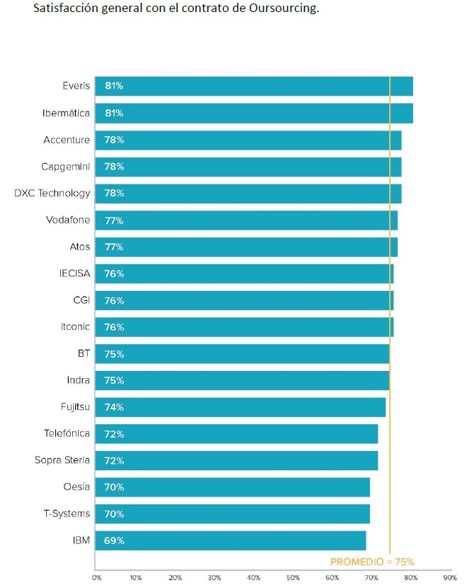 En esta línea, el nivel de satisfacción cliente-proveedor es alto en el mercado español, en relación con el resto de países. El 92% de los clientes se declara satisfecho con su proveedor, sobre todo en áreas como la calidad en la entrega de servicios, la gestión de cuentas o el entendimiento del negocio. En cuanto a los mejor valorados, Everis e Ibermática encabezan un año más el ranking de los mejores valorados con una puntuación del 81%. En segundo lugar, con un 78%, se sitúan Accenture, Capgemini y DXC Technology, seguidos de Vodafone y Atos, valorados con un 77%.