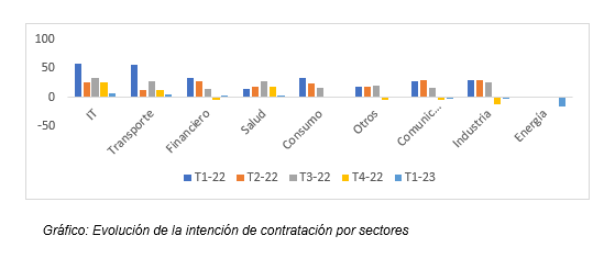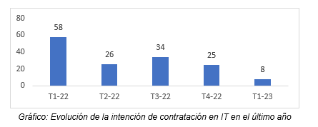 Las estimaciones sobre contrataciones de las empresas españolas del sector IT caen en 50 puntos en este primer trimestre de 2023 respecto al mismo periodo del año anterior; la segunda mayor caída interanual en la comparativa con el resto de industrias analizadas.