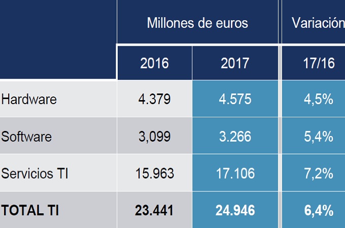 Los tres principales segmentos de actividad que conforman el mercado TI han registrado una progresión positiva: los Servicios TI han crecido un 7,2% y han alcanzado una facturación de 17.106 millones de euros; el mercado del Software ascendió un 5,4% y obtuvo 3.266 millones de euros; y el de Hardware un 4,5% con 4.575 millones de euros.