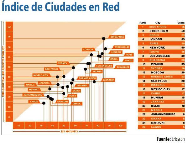 La segunda edición del Índice de Ciudades en Red que ha elaborado Ericsson ha identificado a las 25 ciudades del mundo que mejor han utilizado las TIC en beneficio de la economía, el medio ambiente y la sociedad en general. En los tres primeros puestos figuran Seúl, Singapur y Estocolmo, -huelga decir que España no figura en este ranking de las 25 ciudades más maduras en tecnologías-, porque han sabido encontrar numerosos beneficios a la inversión en TIC. Singapur, por ejemplo, está dirigiendo la innovación hacia la salud online, y es pionero en la gestión de la congestión del tráfico. Por su parte, Seúl está utilizando las TIC para mejorar el medioambiente.