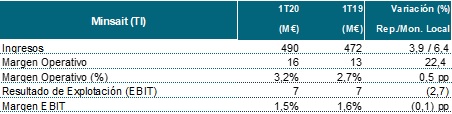 Las ventas de la división de Minsait en el primer trimestre de 2020 aumentaron un 3,9 pasando de 472 millones de euros a 490 millones de euros en 2020, con tres de los cuatro verticales presentando crecimiento. Destacan los crecimientos de doble dígito en moneda local de Telecom y Media y de Servicios Financieros. Administraciones Públicas y Sanidad descendió un 3% en moneda local.