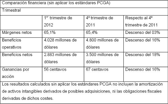 De cara al segundo trimestre, la compañía confía en mejorar sus números llegando a los 13.600 millones de dólares, con una desviación de 500 millones. Con unos márgenes netos: 62%, 63% fuera de los estándares PCGA, (sin incluir la amortización de intangibles derivados de las adquisiciones), en ambos casos con una desviación de 2 puntos porcentuales. En la partida de gastos generales y de administración, marketing e I+D: aproximadamente 4.600 millones de dólares.