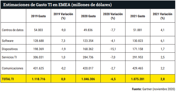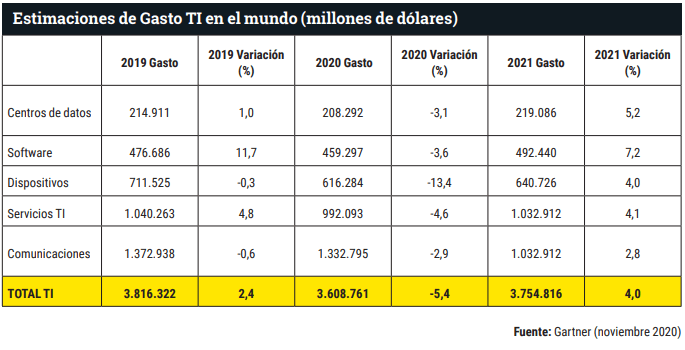 El gasto mundial en TI totalizará 3,8 billones de dólares (3,22 billones de euros, casi tres veces el PIB español) en 2021, un aumento del 4% desde 2020, según el último pronóstico de Gartner. Se calcula que el gasto en TI en 2020 (consolidado) totalice 3,6 billones de dólares (3,05 billones de euros), un 5,4% menos que en 2019.
