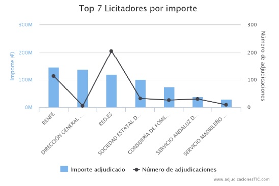 Los mayores adjudicatarios durante 2015 fueron, por número de proyectos, Telefónica, Indra e Informática El Corte Inglés, aunque si atendemos al montante de las adjudicaciones, adelanta posiciones IBM, que se sitúa entre Telefónica e Indra.