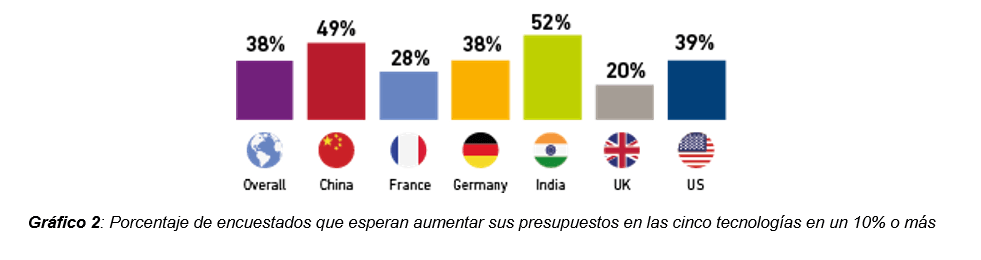 Inversión: Los encuestados de India son los que parecen más interesados en aumentar las inversiones en sus empresas en relación con estas cinco tecnologías. En cambio, los de Francia y el Reino Unido son los más reacios a hacerlo. El informe destaca que la inteligencia artificial será la tecnología que concentre mayores inversiones en los próximos años.