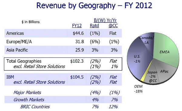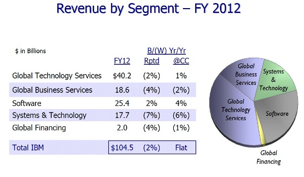 Durante 2012, IBM se ha beneficiado del negocio de software y servicios, que le proporcionan márgenes muy altos. De hecho, las ventas del software de analítica han crecido un 13%, y los servicios de cloud computing, un 80%. Sin embargo, el cambio de divisa, y las menores inversiones de las empresas agravadas por la incertidumbre económica, han vuelto a penalizar sus resultados totales, que se han visto mermados en un 2% sobre los ingresos obtenidos en 2011.