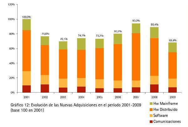 Destaca en primer lugar que el sector financiero español ha disminuido sus gastos e inversiones en Tecnologías de la Información un 7,5 por ciento en 2009; y esta es la primera vez que se produce una reducción en los costes de TI desde el recorte producido tras la explosión de la burbuja de las punto.com en 2001. Recuerda aquí Accenture que el nivel de costes de TI tardó entonces cinco años en recuperarse de nuevo.