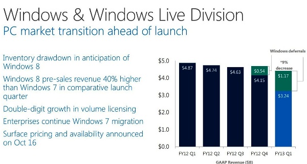 La espera del lanzamiento del nuevo sistema operativo Windows 8, la caída de las ventas mundiales de PC (en EMEA, en el tercer trimestre del año, el descenso ha sido del 7,7% según IDC), y la situación de crisis económica que aún flota en muchas naciones, han pasado factura a los resultados trimestrales de Microsoft.