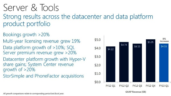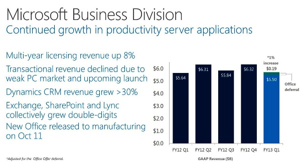Para el siguiente trimestre, no obstante, Redmond ha avisado que estos números mejorarán por la campaña de Navidad, y porque ya estarán en el mercado las nuevas versiones de Windows 8, Office y Surface. De hecho, Microsoft “ya ha certificado más de 1.000 sistemas para Windows 8 de sus partners de hardware, incluyendo desde los tablets más pequeños y convertibles hasta los ultrabooks, los equipos todo en uno y los desktops más potentes del mercado”, ha confirmado Kevin Turner, responsable de Operaciones del fabricante.