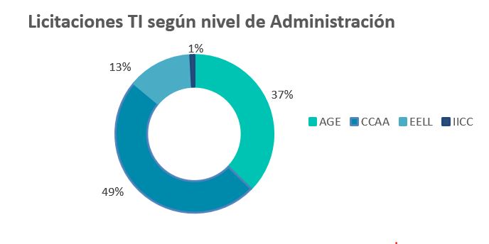 En cuanto a la distribución de las licitaciones TI por nivel de Administración, los datos de 2018 revelan que las Comunidades Autónomas (CCAA) son las que más licitan, con 1.017,52 millones de euros, un 20% más que en 2017. Les sigue la Administración General del Estado, que licita 776,21 millones de euros, un 3% más que en 2017; las entidades locales (EELL), con 273,12 millones de euros, un 2% menos que el año anterior; y las instituciones comunitarias (IICC), con 17,09 millones de euros, que disminuyen un 27% el importe licitado con respecto al ejercicio anterior.