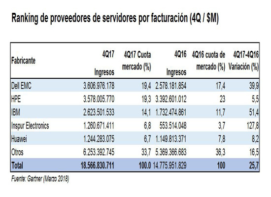 Dell EMC y Hewlett Packard Enterprise (HPE) confluyeron en el mercado mundial de servidores en base a los ingresos en el cuarto trimestre de 2017. Dell EMC cerró el año en el puesto número uno con una cuota de mercado del 19,4%, seguido de cerca por HPE con el 19,3% del mercado. Dell EMC experimentó un fuerte crecimiento en el trimestre con un crecimiento del 39,9%. HPE creció un 5,5%. Inspur Electronics experimentó el crecimiento más fuerte en el cuarto trimestre de 2017 con un crecimiento del 127,8%.