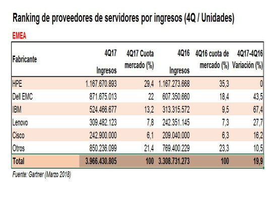 Los ingresos de servidores en EMEA totalizaron cuatro mil millones de dólares, creciendo un 19,9% desde el cuarto trimestre de 2016