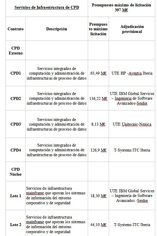 El contrato de servicios de infraestructuras de CPD de la Generalitat de Cataluña se divide en dos pliegos (CPD Externo, que incluye, en cuatro lotes, el grueso de los sistemas de información de la Generalitat, y CPD Núcleo, que incluye, en dos lotes, los sistemas de información de seguridad y de emergencias de la Generalitat), con una duración de entre 6 y 10 años, con un presupuesto máximo de licitación de 397 millones de euros y un presupuesto anual máximo de licitación de 45 millones de euros.