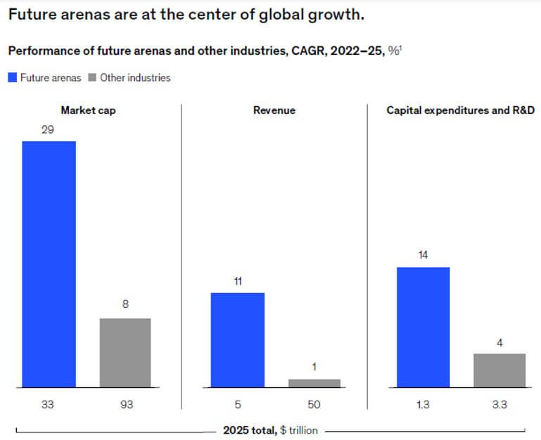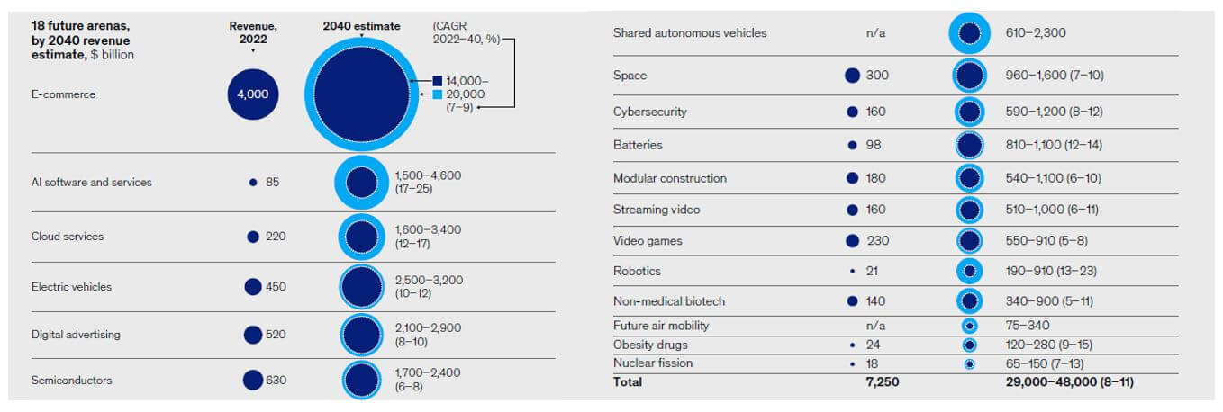 Un conjunto de 18 industrias estratégicas -denominadas ‘arenas’ e integradas por sectores como la IA, el comercio electrónico, el software, los vehículos eléctricos, los semiconductores o la robótica– se perfila como el principal motor de crecimiento futuro, con capacidad para generar hasta 48 billones de dólares en ingresos para 2040.