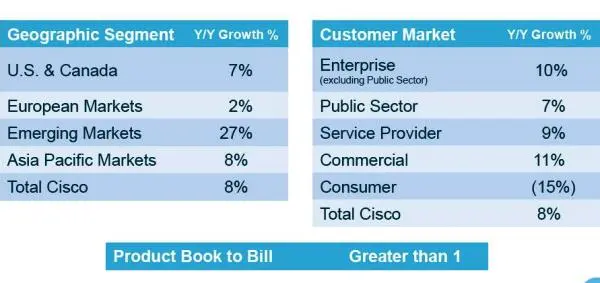 Quitando este tema de los beneficios, no se puede negar que Cisco ha obtenido un buen trimestre en cuanto a ventas se refiere. Su facturación total ha sido de 10.400 millones de dólares, esto es un 6% más que en el mismo periodo de 2010. Además, supera los pronósticos de Wall Street, que estimaba unos ingresos de 10.230 millones.