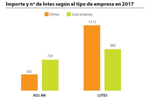 Desde el punto de vista del número de adjudicaciones, la distribución se invierte significando un 58% de las mismas a pymes y el 42% restante a gran empresa. Para realizar la diferenciación entre los dos tipos de empresa se ha tenido en cuenta el concepto de pyme de La Comisión Europea, a través de su Recomendación 2003/361/CE, en la que se definen los conceptos de microempresa, pequeña empresa y mediana empresa, distinguiendo la mediana empresa como la que tiene menos de 250 trabajadores y una cifra de negocio anual (facturación) no superior a 50 millones de euros (con los datos recopilados de distintas fuentes en el ejercicio 2016).