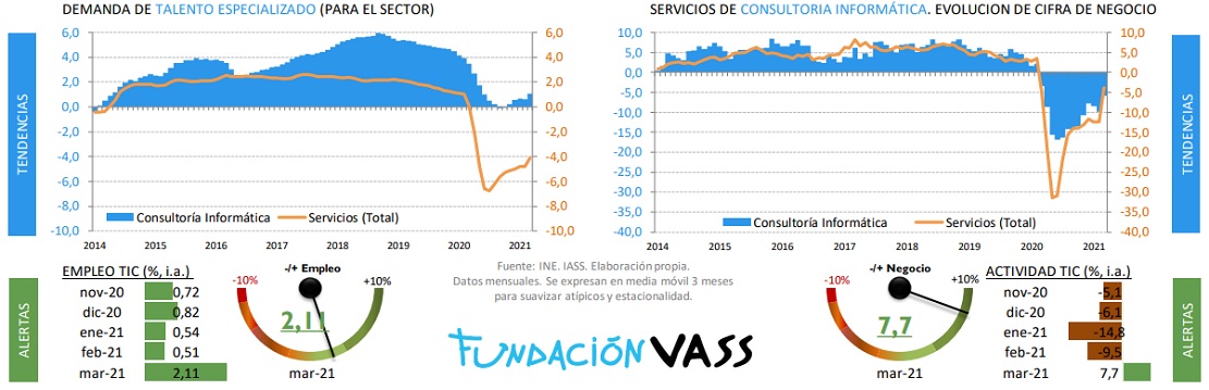 “Este fuerte rebote tiene una componente estadística, derivada de tomar como mes base el primero del confinamiento (marzo 2020). Es la primera foto interanual que cubre un período íntegramente afectado por la coyuntura covid-19. Aun así, estas cifras revelan el inicio de la recuperación económica, de la mano de uno de los sectores, el de los servicios digitales, que se han posicionado como más resilientes y representativos del nuevo paradigma económico”, indica Antonio Rueda, director de VASS Research y responsable de TIC Monitor.