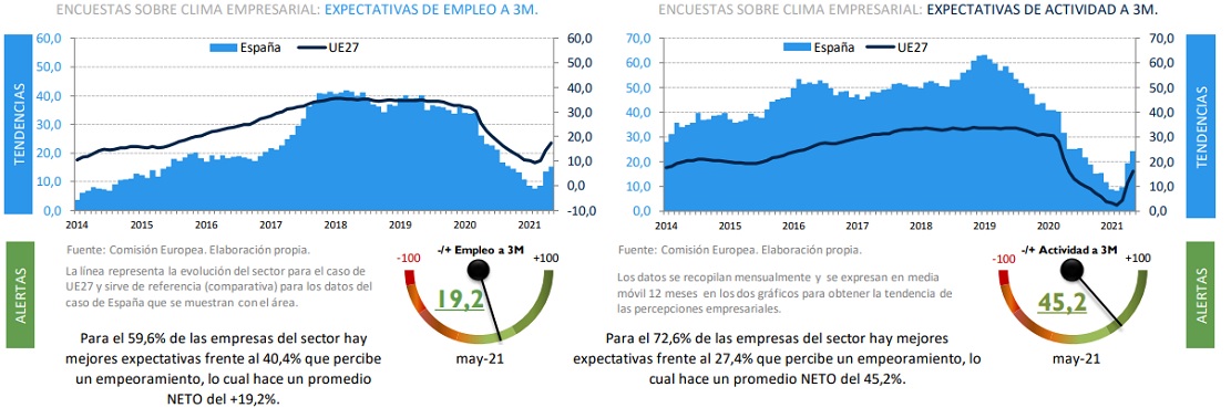 Los empresarios mantienen su tono positivo y la gran mayoría prevé un crecimiento de la actividad a corto plazo, entre junio y agosto. El indicador se sitúa en línea con la anterior entrega, +45,2 puntos en una escala de +/-100. El 72,6% de las empresas del sector tiene, por tanto, mejores expectativas, frente al 27,4% que percibe un empeoramiento en su facturación. Este indicador es un 61% más optimista en España que el promedio de la Unión Europea.