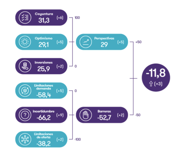 Las barreras al crecimiento, por el lado del contrario, se moderan y pasan de -54,6 a -52,7 puntos. Estos obstáculos incluyen aquellos elementos que van a frenar el crecimiento de las empresas medianas, como la preocupación por la incertidumbre económica, las limitaciones que les harán ofertar menos productos o servicios o las barreras de demanda en los pedidos.
