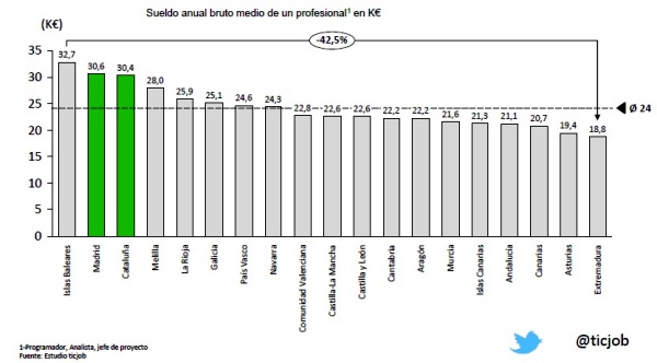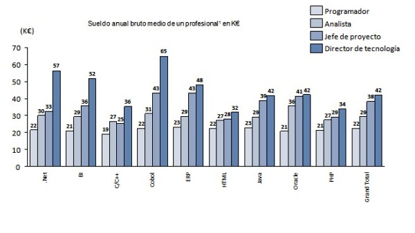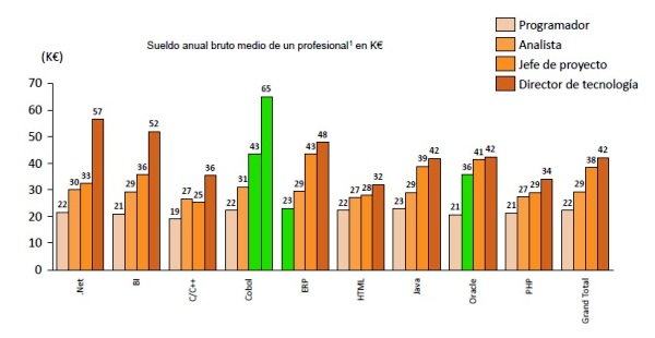 Por otro lado, en cuanto a retribución salarial, teniendo en cuenta factores como la categoría profesional, las áreas funcionales, la experiencia o la región, los expertos en Cobol son los mejores pagados. Según se extrae de este estudio, el nivel de sueldo de las tecnologías está directamente relacionado con la complejidad para encontrar el perfil. De este modo, la tecnología Cobol es la mejor remunerada debido a la escasez de profesionales, seguida de .Net, Business Intelligene, ERP, Java y Oracle. En función de la categoría profesional, el perfil mejor remunerado es el director de tecnología Cobol, cuyo sueldo medio anual es de 65.000 euros. El jefe de proyecto mejor pagado también coincide con esta tecnología, cuyo salario medio es de 43.000 €. Los técnicos analistas de la tecnología Oracle dominan en el capítulo de sueldos en su categoría, con una media de 36.000 €; mientras que en el caso de los programadores, los más aventajados en el capítulo de sueldos es el especializado en la tecnología ERP.