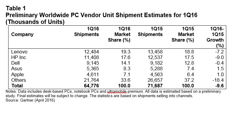 Las ventas totales de PC a nivel mundial fueron de 64,8 millones de unidades durante el primer trimestre de 2016, que representan un descenso del 9,6% con relación al mismo trimestre de un año antes, según las estimaciones iniciales de Gartner. Como datos significativos, es el sexto trimestre consecutivo que declinan las ventas y que por primera vez desde 2007 se baja la barrera de los 65 millones de unidades.